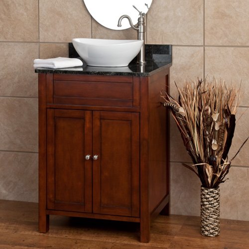 #Simple lines, classic style and a beautiful stone countertop combine to make a grand statement in your half-bath or powder room. The 24 Darin Vanity Cabinet features Brushed Nickel hardware, two doors and a beautiful Cherry finish. Solid hardwood construction with a Cherry finish. Features two doors for ample storage. Brushed Nickel hardware. Vanity set includes the vanity base and stone countertop with backsplash. Vanity only dimensions: 24 L x 21 W (front to back) x 34 H (± 1/2 ). 2 diameter cutout for vessel sink. Custom drilling option allows you to choose a center, right offset or left offset single hole faucet drilling for granite or marble countertops. See related products. Crystallized glass stone top is pre-drilled with a left offset single hole faucet drilling (8 from drain hole to offset faucet hole). No custom drilling is available. Sink and faucet sold separately. Polished Carrara Marble is from Italy. Also available as vanity cabinet only.