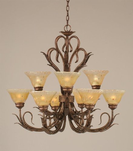 Bronze Finish 9 Light Uplight Chandelier w Amber Crystal Glass