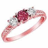 18K Rose Gold Round 3 Stone Diamond and Pink Tourmaline Ring With Cobra Design Shank (0.95 ctw) SizThis dazzling sparkling timeless ring is classic and can be used as an engagement ring, anniversary ring, bridal ring, promise ring, proposal ring, fashion ring, wedding ring, cocktail ring and also to represent eternal love between you and that special someone. This 18K rose gold diamond ring is prong set with 2 round diamonds and 1 round Pink Tourmaline gemstone. The total carat weight of all the stones are approximately 0.95 carats. The diamonds are H-I color and SI-I2 clarity. The ring band measures approximately 1.80 mm wide and 1.0 mm thick.....