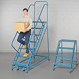 | ✚✚✚ EUROKRAFT 50° Stairway Slope Ladders Strong, sturdy EUROKRAFT 50° Stairway Slope Ladders incorporate extra structural supports to place these among the most durable industrial ladders on the market today. Eurokraft’s one-of-a-kind design includes: extra hand rail supports, added angle iron supports, and unlike other manufacturers’ models, all ladders feature full-length hand rails. Easy climbing pyramid design comes in a 50° slope which allows user to turn and descend facing forward while holding a heavy, bulky load. Large 7" deep steps with 14" deep top platform feature either perforated tread for general use or serrated tread for oily or wet environments. Heavy reinforced base supports up to 300 lbs. Ladder frames are constructed of strong, square tubing that provides 40% greater strength than round tube design. 2–4-step units include spring-loaded casters that secure reinforced base to floor. 5–10-step models use a positive Lock-Safe device. Ladders shipped unassembled—5-step and higher unassembled ladders are shipped in a protective crating. Meet ANSI standards.