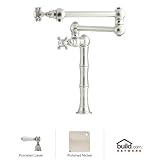| ✚✚✚ Rohl A1452LP-2 Country Kitchen Low Lead Deck Mounted Pot Filler Faucet with Porcelain Lever Han, Polished Nickel Country Kitchen Low Lead Deck Mounted Pot Filler Faucet with Porcelain Lever Handles Born in the Piedmonte region of France, an area known for its rich tradition of cuisine and culture, the Country Kitchen collection is defined by exquisite design. Straight lines are paired with gentle curves and ribbing details to create a classic look that is as popular today as it was years ago. And with function set as the cornerstone of all Rohl products, rest assured that the beauty of the Country Kitchen collection does not overshadow its use. Smooth handle operation, lifetime ceramic disc valves, and a sturdy feel that only all-brass construction could allow are all defining features of the Country Kitchen collection. As one of Rohl's largest collections, you will find that there are a variety of bold styles and finishes to choose from. Rohl A1452LP-2 Features: All brass faucet body construction - weight: 11 lbs. Hand-machined from solid brass stock Industry leading, 1/4 turn lifetime ceramic disc valve Superior finishing process - chemical, scratch, and stain resistant Single installation hole Pivoting arm - number of pivot locations: 2 Folds away when not in use Dual quarter turn lever handle shut-offs, one at the wall and one at the outlet - eliminates need to reach over hot burners Spout shut-off prevents dripping 2.5 gallons-per-minute flow rate Installs onto decks up to 2-9/16" thick Porcelain lever handles included Overall height: 20" (measured from counter top to highest point of faucet) Spout reach: 22" (measured from center of faucet base to center of faucet outlet) 1/2" female NPT connection Low lead compliant - complies with federal and state regulations for lead content Designed for use with standard U.S