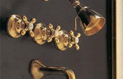 #The Rhine Tub & Shower Set with cross-point handles with porcelain buttons.Tub and shower combination sets include: 3 valves with connectors (one each for hot and cold water supply and shower diverter), 3 escutcheons, 3 locknuts, 3 handles, spout, and showerhead with arm and escutcheon