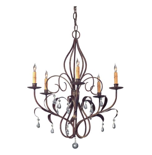 Features27 inches high x 22 inches diameterConstructed from wrought iron and crystalVenetian bronze finishFive 60W bulbs not included.Includes 3 feet of chain Curved Wrought Iron Art Nouveau Chandelier?