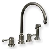 | ✚✚✚ Evolution Two Handle Widespread Kitchen Faucet with Side Spray Finish: Polished Brass WH15664-PBRAS Finish: Polished Brass Features: -Widespread kitchen faucet.-Contemporary style.-Double lever handles.-With fluted side spray.-Gooseneck swivel spout.-Lever style handles.-Lever style handles.-8'' center to center. Construction: -Solid brass construction. Dimensions: -Spout length: 9.5''.-Height: 7.13''. Collection: -Evolution collection.